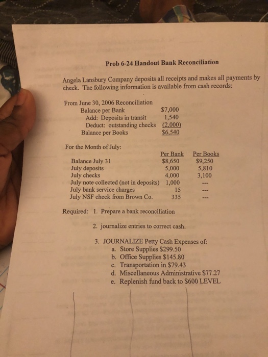 Solved: Prob 6-24 Handout Bank Reconciliation Angela Lansb... | Chegg.com